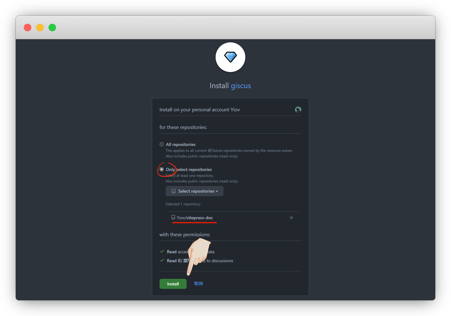 选择 Only select repositories,再指定一个你想开启讨论的仓库