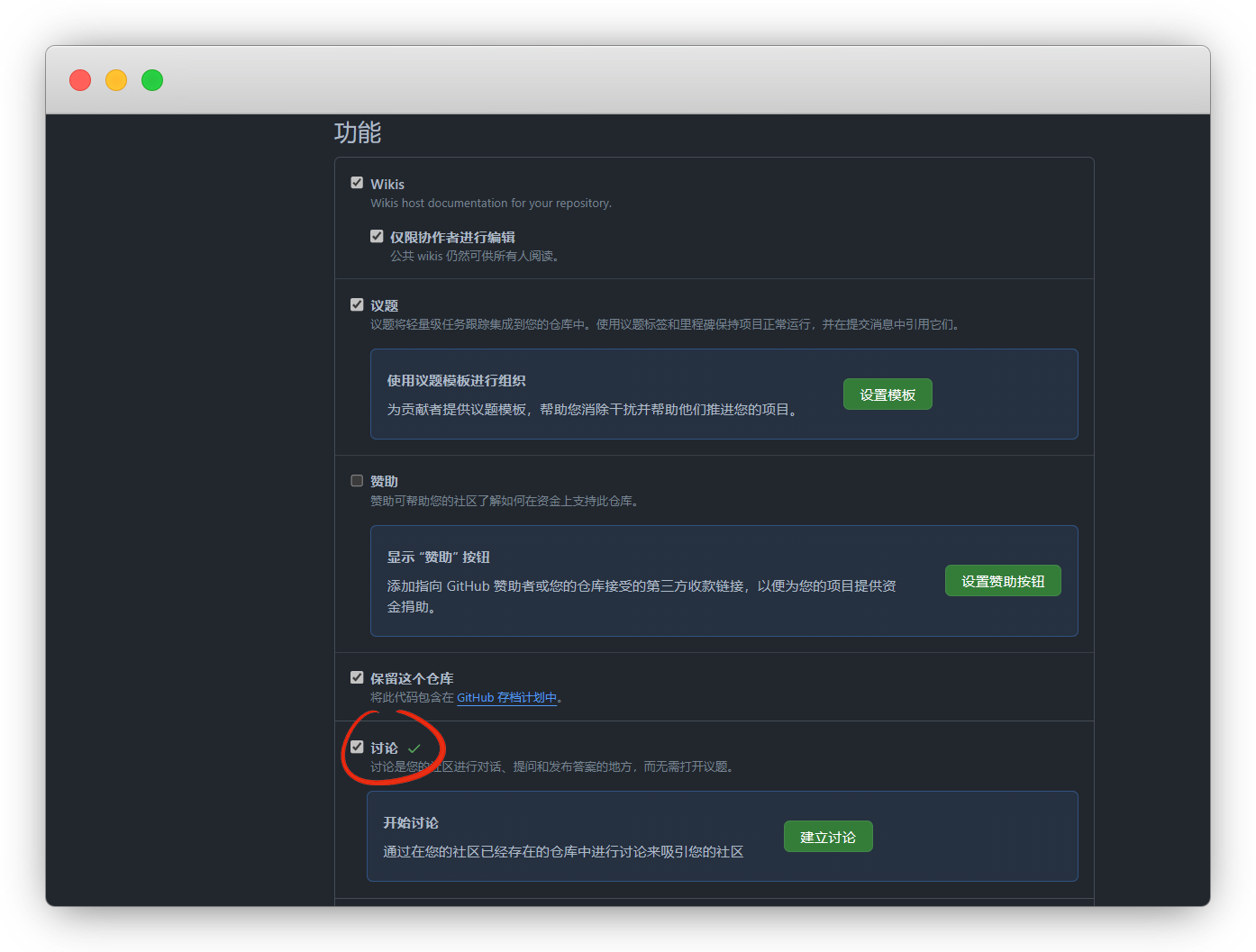 我们进入要开启讨论的仓库,点设置 - 勾选讨论 Settings - discussions